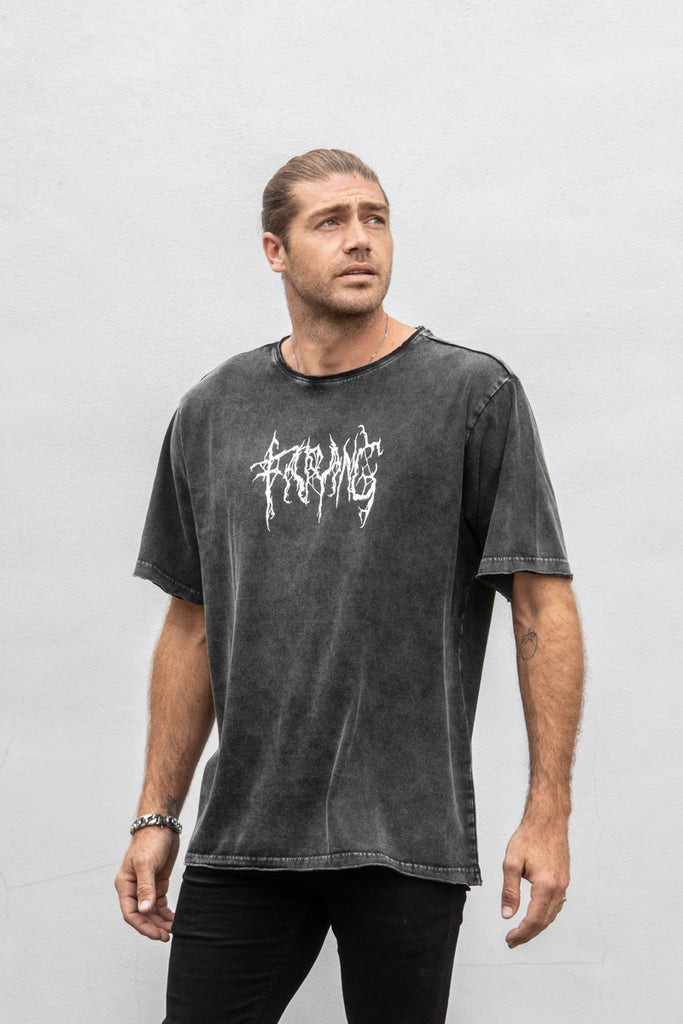 The boxy t-shirt cut we know and love. Featuring a faded black fabric with a white grim “Farang” text on the front and our grimy logo for this collection on the Back. Special wash ensures it keeps its intended look after a hundred rides in the washing machine. 100% cotton.
