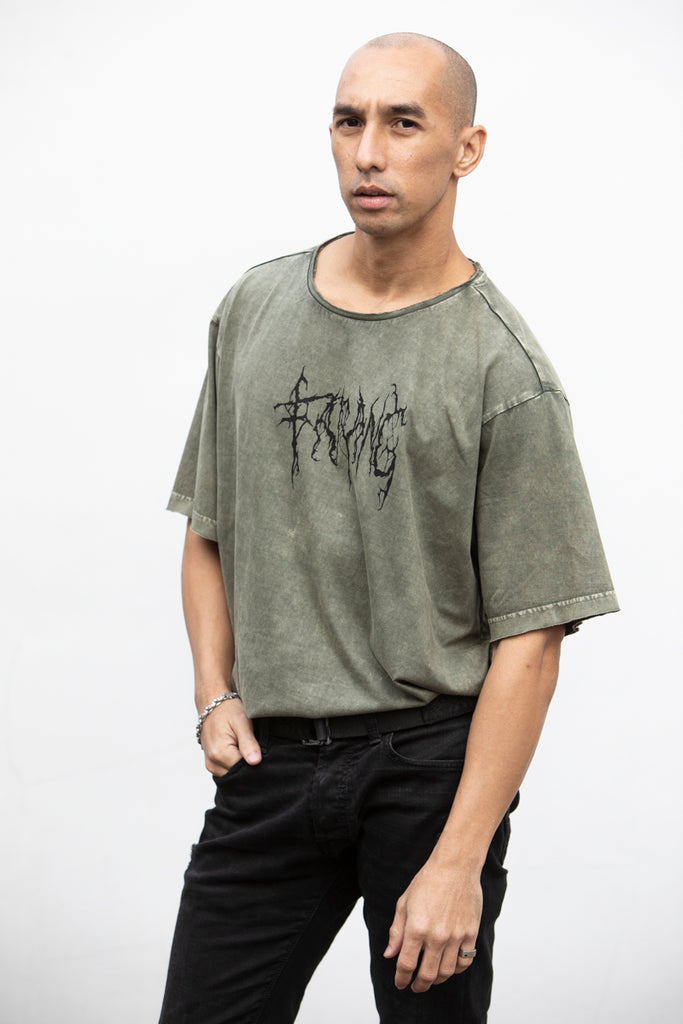 The boxy t-shirt cut we know and love. Featuring a faded green fabric with a white grim “Farang” text on the front and our grimy logo for this collection on the back. Special wash ensures it keeps its intended look after a hundred rides in the washing machine. 100% cotton.