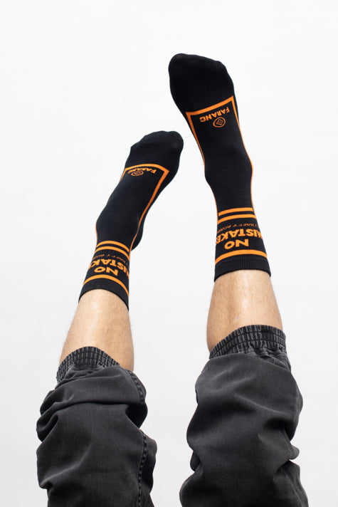 "NO MISTAKES- only happy accidents" is the orange text on your shin while wearing these socks. Busted up shins aka "Shinjuries" are sadly an event every Freerunner is used to. These socks won't do much to protect you from a messed up landing, however they will remind you straight away that there's a positive lesson to be found in any mistake. Many of the our most creative tricks started out as mistakes or accidents, so stop crying and get back to work!