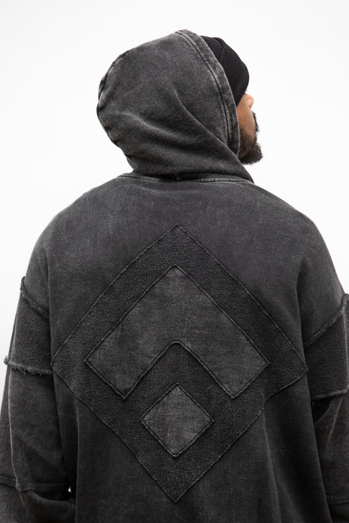 For our designs we like to combine both practicality and aesthetics. Patchwork zip hoodie was created with the idea in mind that when the inevitable ruin of the garments come they should only look better. Frayed patches that create the Farang symbol, massive patch pockets, and cuffs and hems that are cut open.